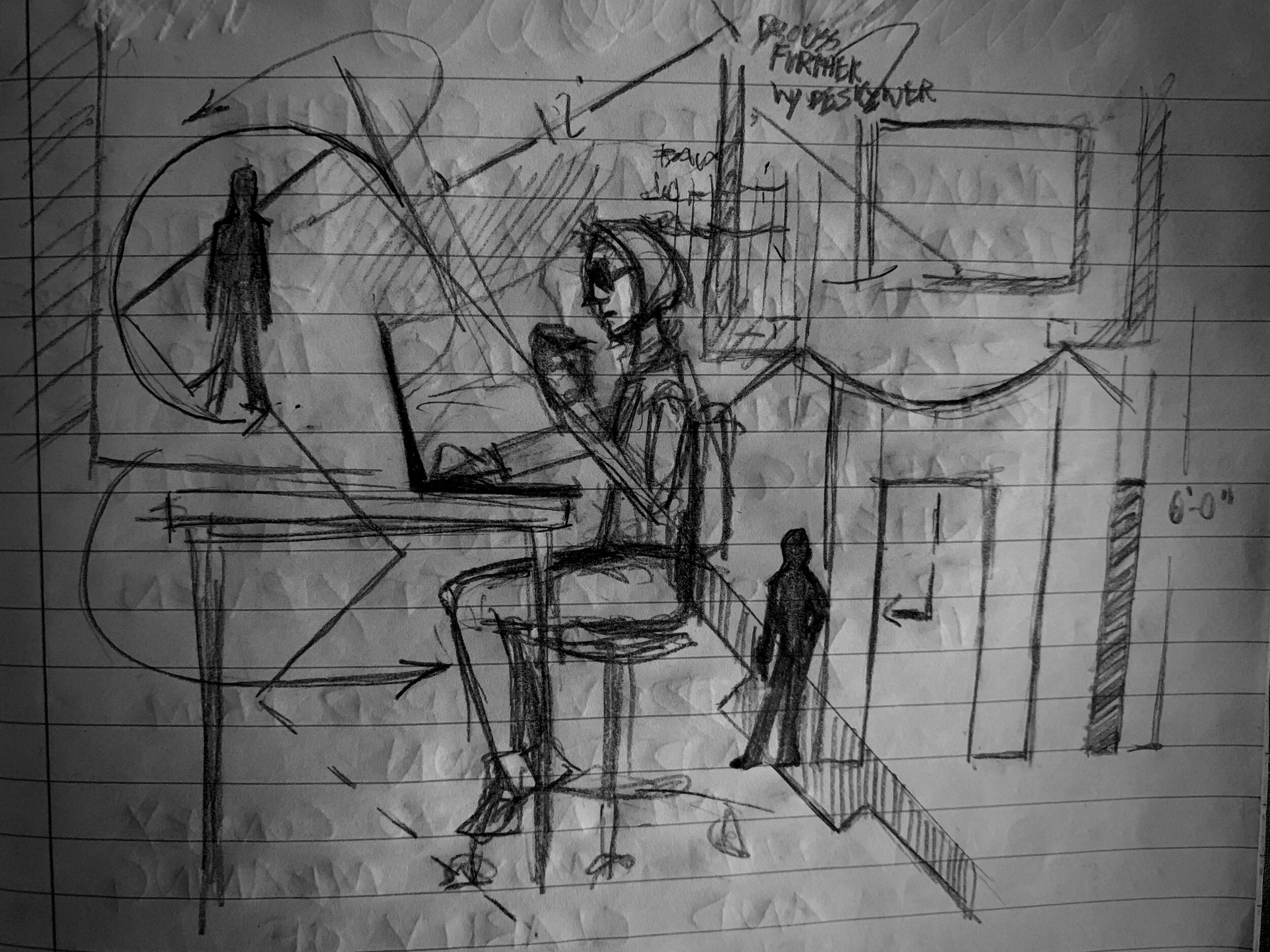 And so, I am. I’m taking this space to open up my process. I’m going to walk through the wild places of how the scenic design for this show came into being and show you, to the best of my abilities, what that design would have looked like had you had the opportunity to see the production. Obviously, no paltry model photos or orderly drafting will ever equal seeing a production. However, I would pose these questions to you; how often do you really get to see the design process showcased? How often does a designer stop to really show all the pieces that went into the model box in the display case at the end? Also, how often do we find ourselves with a little more time to actually explore that process in such detail?
