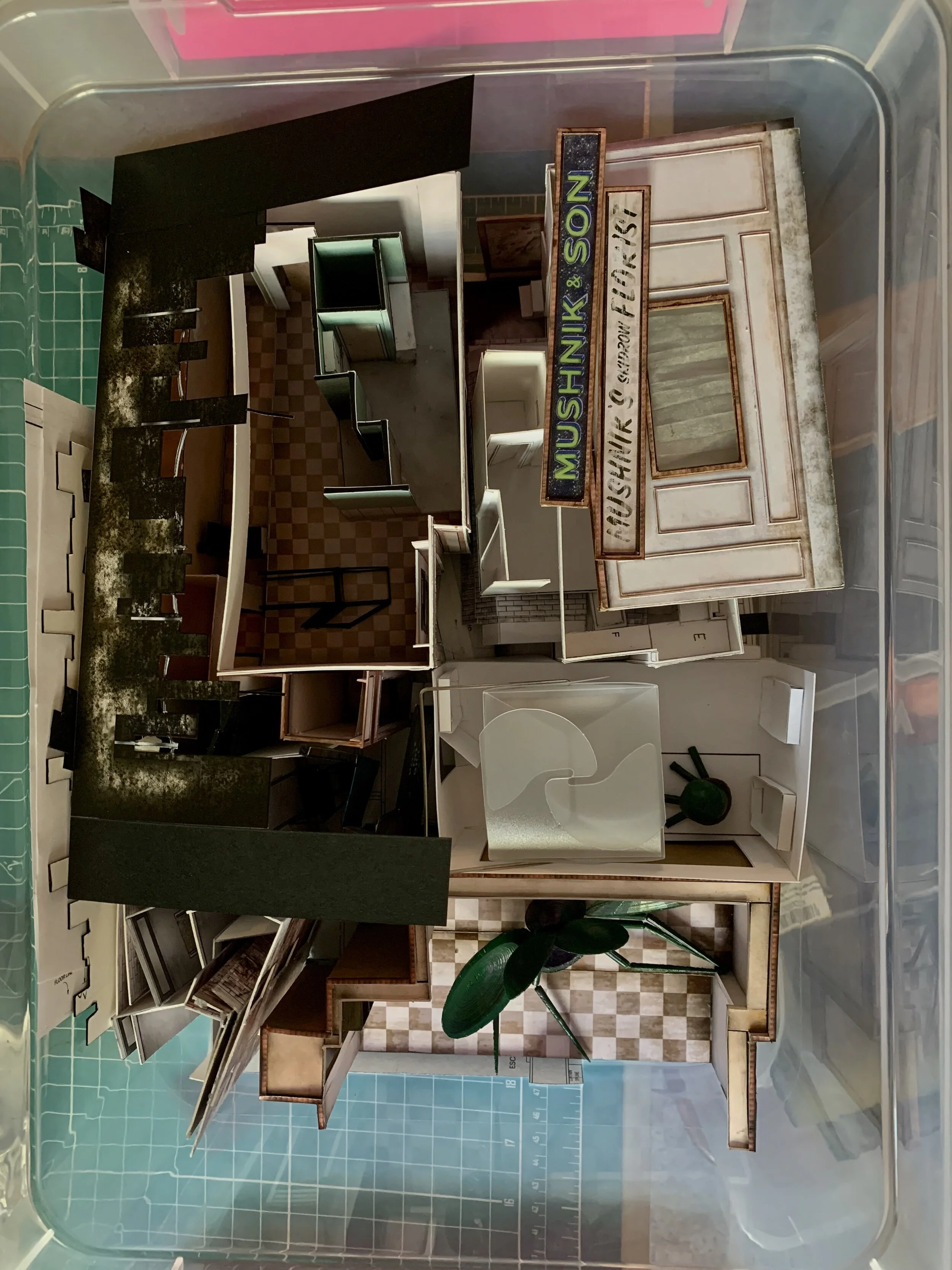 As mentioned in the post about the white model, models are kind of the rockstars of the scenic design world. More and more, digital renderings are becoming more common as a modeling tool as opposed to physically building the model. I’m personally all for both methods. I think there’s place and space for all the ways we choose to communicate as artists; using the method that best fits the situation rather than clinging to or creating arbitrary standards. In the case of Little Shop, I made a physical model. What follows are the pictures of a “scene by scene” I created using this model. Because the show was halted before actors could get into rehearsal, these depictions are mostly from my own musings, going off of conversations with the director and the rest of the creative team. No doubt the director and actors would have brought more vigor and nuance to these static shadows, but given our circumstances, this is what I built with what I had.